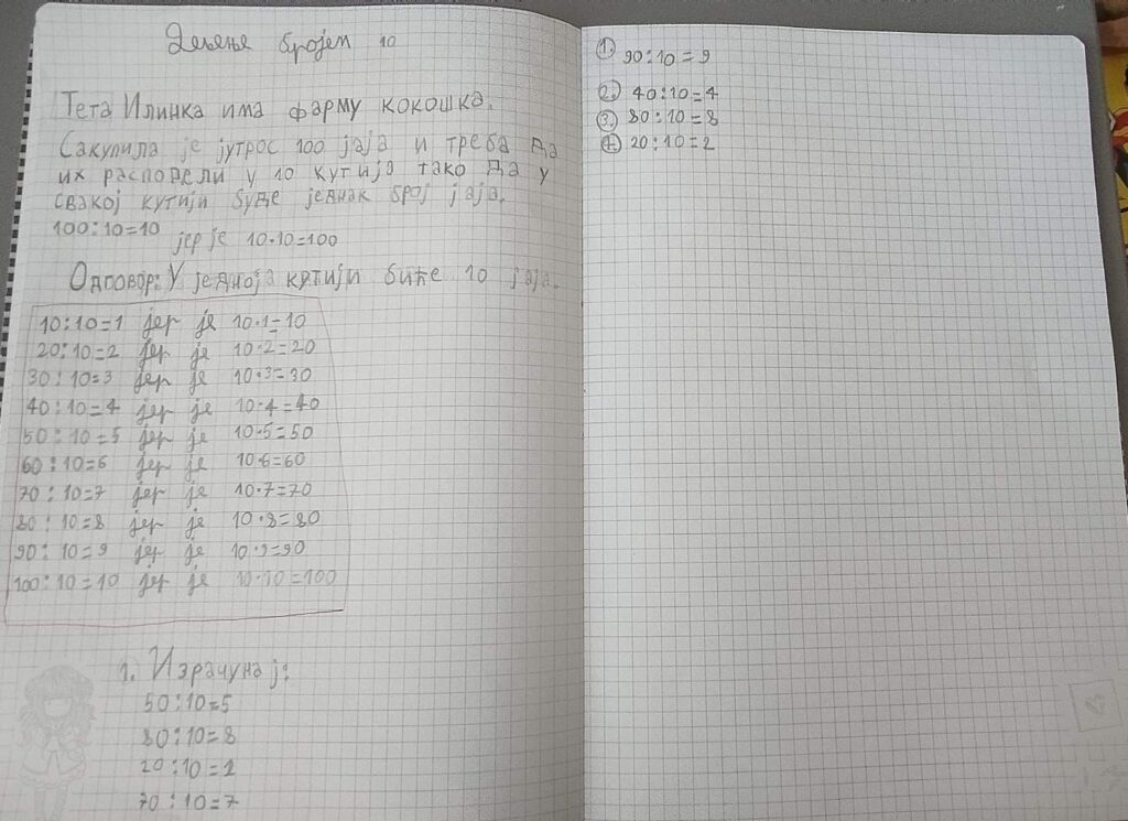 Дељење бројем 10, рад на задацима у свесци.