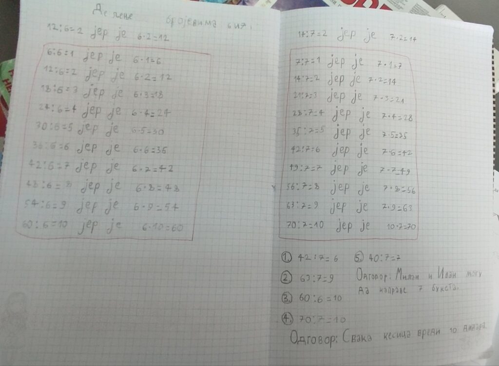Дељење бројевима 6 и 7, рад на задацима у уџбенику и у свесци.
