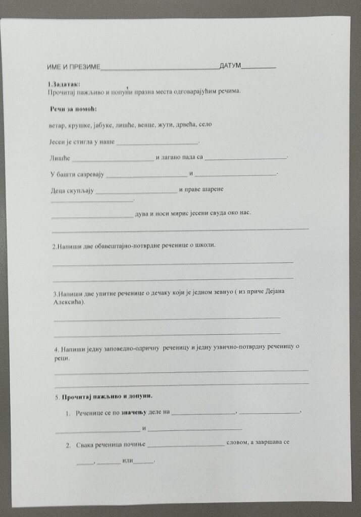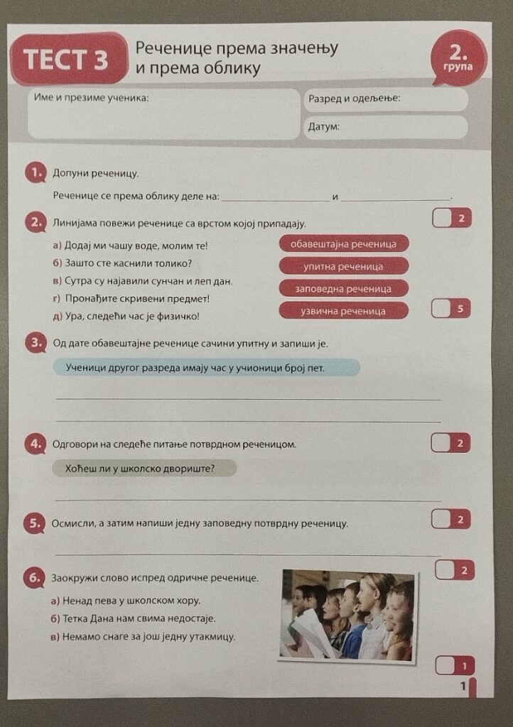 Данас смо прво на часу обновили знања о реченицам по значењу и облику. ( тест-вежбање се налази у вашем портфолију)Другог час сте радили тест.
