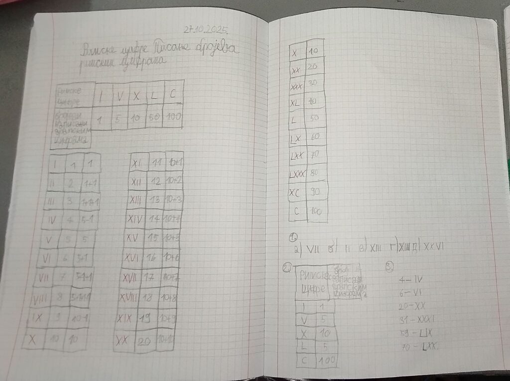 Римске цифре, писање бројева римским цифрама,рад на задацима у свесци.