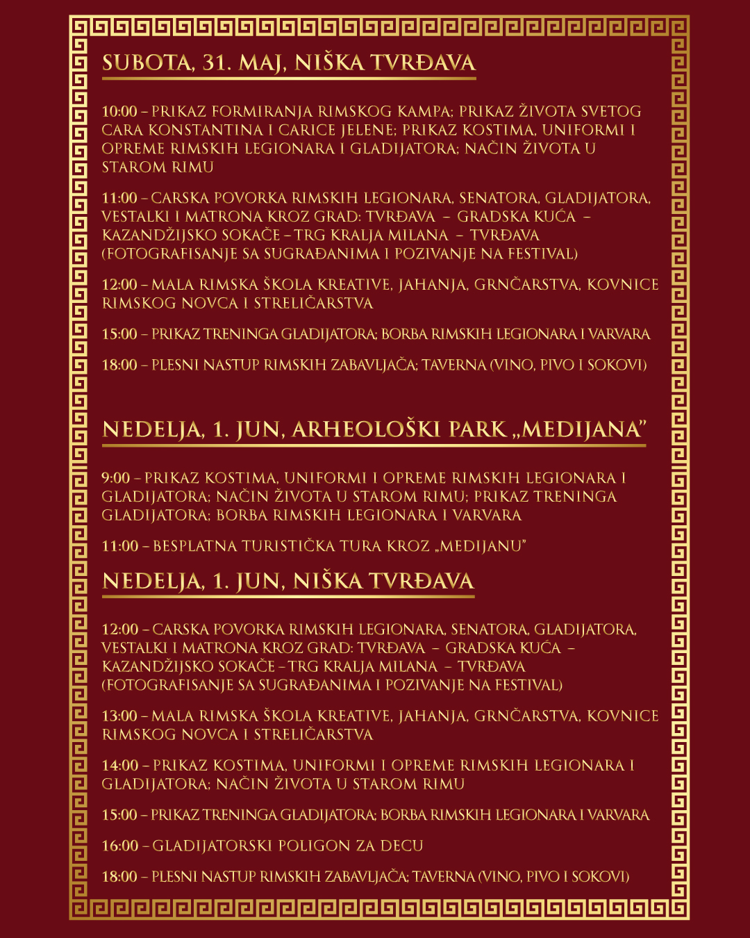 Фестивал почиње у суботу у 10 часова у кругу Историјског архива у Тврђави, док је у 11 планиран спектакуларни дефиле римских сенатора, војника и матрона кроз центар града. Програм другог дана, 1. јуна, сели се делом и на локалитет Медијане, уз едукативне садржаје о римском војном логору.