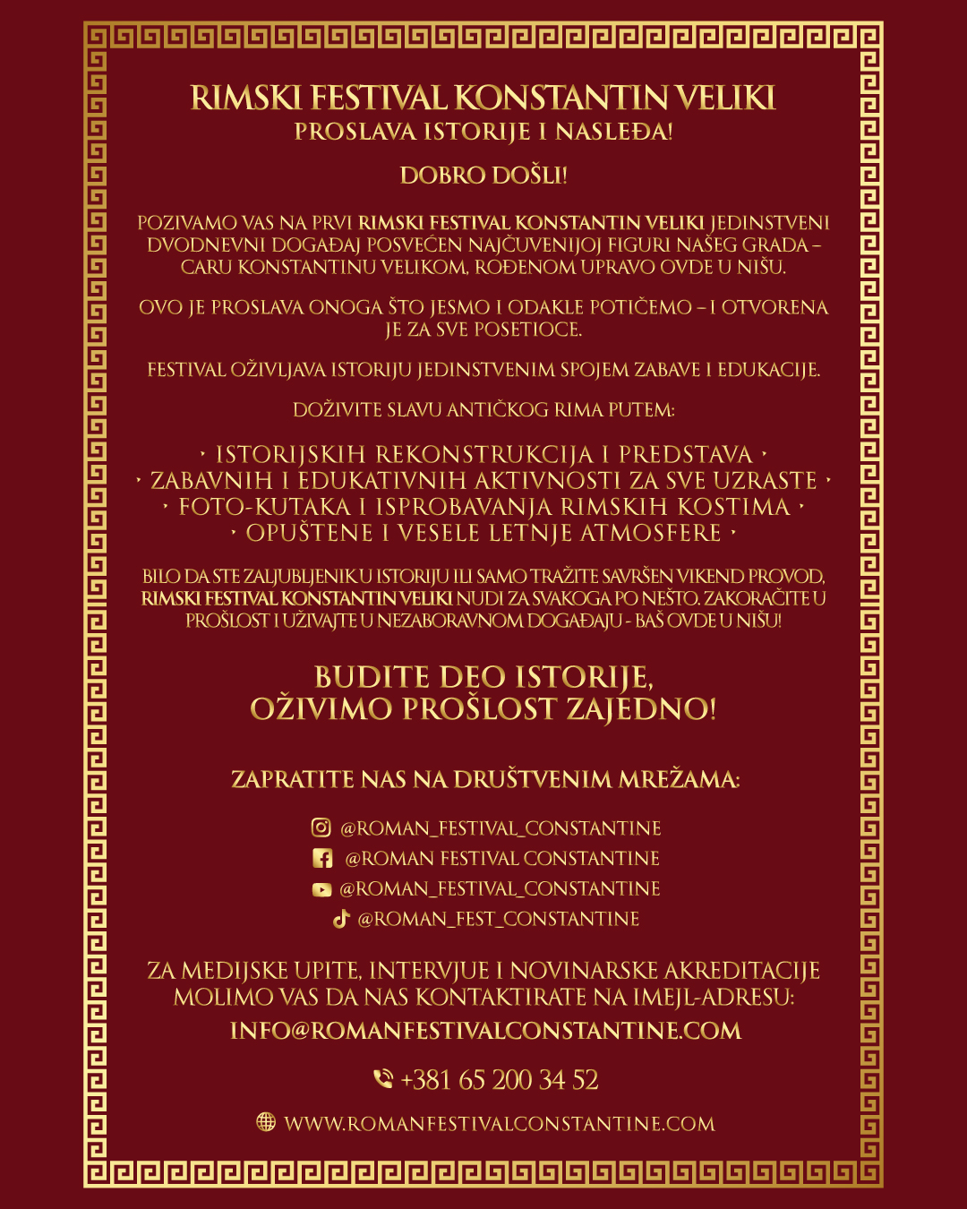 „Овај фестивал симболично враћа стару славу Нишу и Медијани и позиционира град као незаобилазну тачку европског културно-историјског туризма“, поручују организатори.