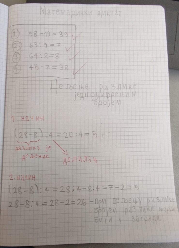 Дељење разлике једноцифреним бројем, рад на задацима у свесци и у уџбенику (12-15.стр.)